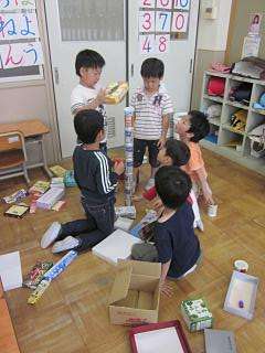 おうちの人にも協力していただいて集まった,たくさんの空き箱や空き缶!
