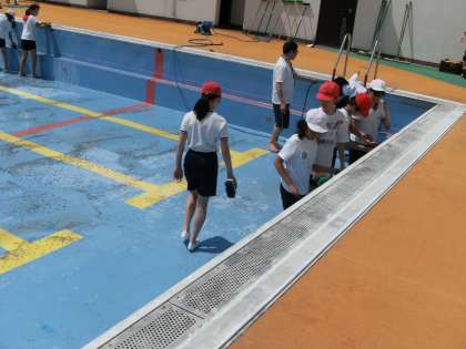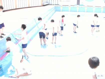 6月6日(水)に6年生がプール掃除をしました。一人一つ、ブラシを持ってプール側面を上から下へ、汚れを落としました。もうすぐ始まる水泳学習を楽しく安全にできるように、一生懸命取り組みました。18日から始まる水泳学習が楽しみです。