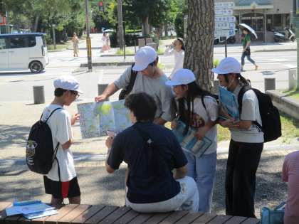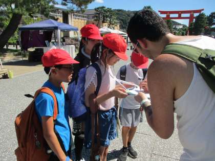バレエを鑑賞した後は、会場の近くにある平安神宮で外国人観光客の方にインタビュー活動を行いました。京都の魅力について、事前に準備したアンケートパネルなどを使いながら、学習した英語でコミュニケーションをとりました。初めは声をかけるのをためらっていましたが、徐々に話すことに慣れ、楽しく活動できました。
