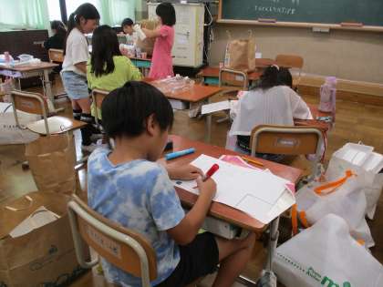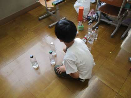 生活科でペットボトルや紙コップなどの資源ごみを使って、遊びやゲームを考えています。作った遊びやゲームをみんなで楽しむために準備を進めています。ペットボトルのキャップをボールに見立てたり、箱や卵パックなどを積み上げて高さを競い合ったりしていました。