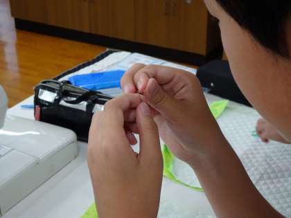 慣れないミシンに、糸をかけていくことは、難しそうなのですが、慌てず順番に上糸、下糸をセットしていきます。