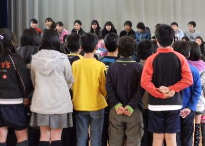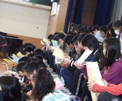 6年生にインタビューしたり,各学年から歌やダンス,言葉のプレゼントをしたりしました。また,たてわりグループで5年生が中心になりつくったメッセージカードもプレゼントしました。6年生からは,ぞうきんのプレゼントがありました。中学校に行っても,元気にがんばってほしいと思います。