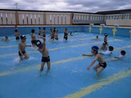 心配していたお天気もなんとか味方してくれてみんな大喜び。約30センチの深さのプールで,列車ごっこやワニさん歩きなど,水に慣れる活動をしました。