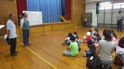 当日は,お天気に恵まれ,40人あまりの参加者が京都バスで,中川小学校へと向かいました。まず,体育館でお世話くださる中川の地域の皆様にご挨拶をし,中川小学校についてお話を聞きました。