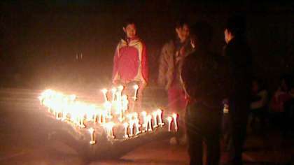 夕食の後はふれあいキャンドル(キャンドルファイア)。キャンドルの火を囲んで,レクレーション係がゲームやクイズなどをしました。
