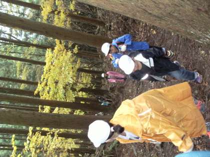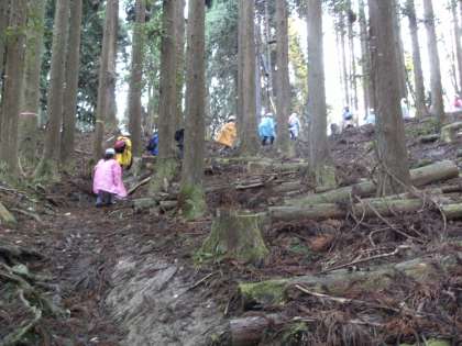雨はやみましたが、いつ降り出すかわからない曇り空のため、雨具を着ての出発です。コースは、天狗杉折り返しコースとなり、昼食は、戻ってきてからとなりました。