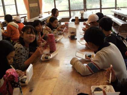 滑る山道を全員無事1時過ぎに登って帰ってきました。山の上で食べる予定だったお弁当を食堂で食べました。食べているときに、雨がザーッと降ってきました。雨にぬれなくてよかったです。2時から早い目の入浴をし、さっぱりとして休憩をしています。