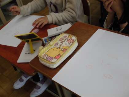 5年生が,「5年生になった自分の顔をよくみて描こう。」という目当てで,鏡で自分の顔を見ながら自画像を鼻から目というように,顔の中心から外へむかって描きました。