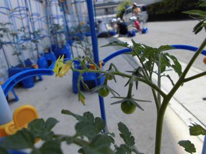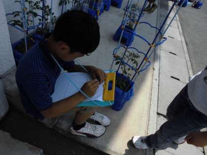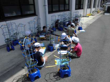 子どもたちは,算数で使えるようになった竹尺を使って草丈を測ったり,色や形に目を向けたりしながら,かんさつ名人になるためにがんばって観察していました。もう実もなりはじめ,実の成長を待ち遠しそうにしていました。