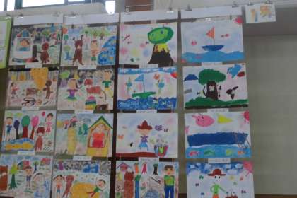1年生は,「コロコロ ゆらりん」の工作と「みてみて おはなし」「たのしいプール」「うつした かたちから」の絵を展示しました。