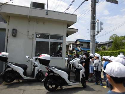 5月11日(木)の2・3時間目に校区の探検に行きました。今日は,学校の西側を探検しました。初めに小松原公園で休憩しました。次に小松原交番に行き,等持院公園で2回目の休憩をしました。その後嵐電の前の道を通って,学校に戻ってきました。暑かったですが,みんな元気に過ごしていました。帰ってから,「見つけたよ カード」に自分が印象に残った建物や公園や店などを絵に描いたり,気が付いたことを書いたりしました。