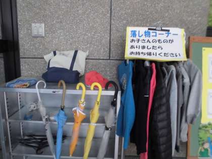 玄関のドアの横に落し物コーナーがあります。暑くなって,脱いだ服を忘れる子が増えています。傘の忘れ物もあります。家でも自分の服や持ち物には名前を書いて大事にすること・自分のものがないか落し物コーナーをよく見てくるようお声かけください。