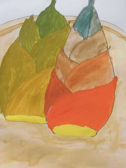 図工の時間に色の三原色を使って色を作ることを教わりました。そのできた色を使って「たけのこ」に色を付けました。今日は,そのできた筍の絵をクラスで鑑賞しました。