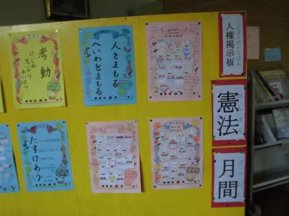 5月は「憲法月間」です。5月1日(月)の朝会の校長先生のお話の後,各教室で憲法について話し合いました。みんな憲法(人権)についてしっかり考え,自分のがんばりたいことや考えたことを一人一人紙に書き,画用紙に貼りました。