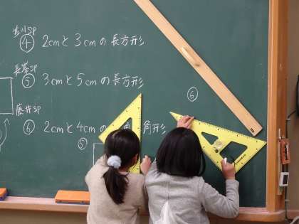 黒板で、大きな三角定規を用いて課題を解き、表すことができる普段の様子です。使いこなしている姿は頼もしいかぎりです。