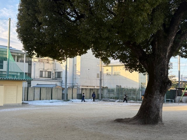 とても寒い朝ですが、うっすらと積もった雪に向かって走っていく子どもたち。