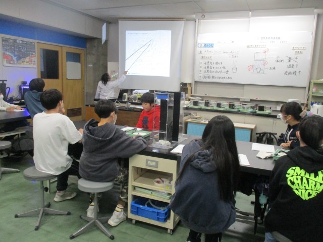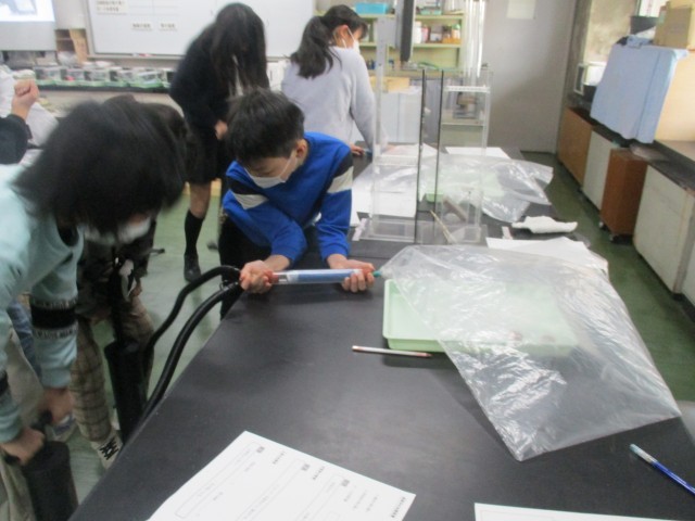 1組は、地学の「雲」について学習しました。蒸発させた水蒸気を冷やすことで、自分たちで雲を発生させました。