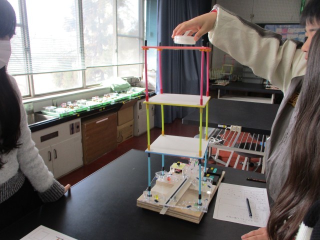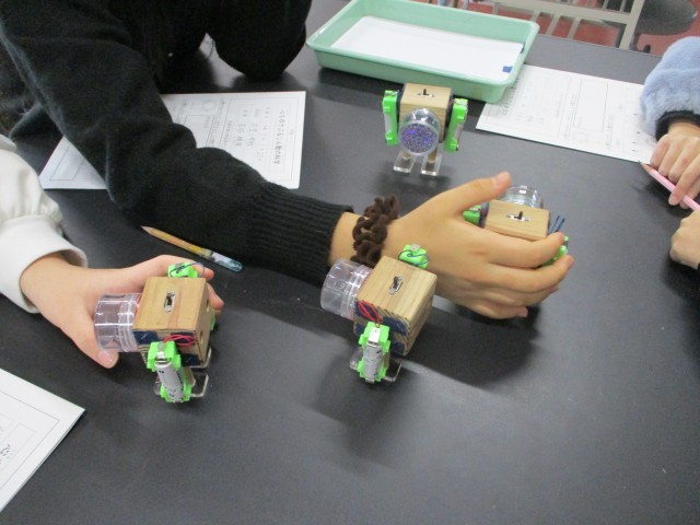 2組は、物理の「振動」について学習しました。振動を「活かす」「消す」の2つの観点から、実験を通してロボットを動かしたり、耐震や制震について考えたりしました。