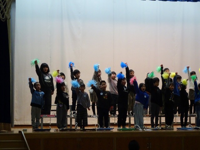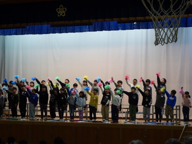 1年生は、発表の最後に「LET'S GO! いいことあるさ」の合唱です。全校のたくさんの児童の前で少し緊張していたようですが、