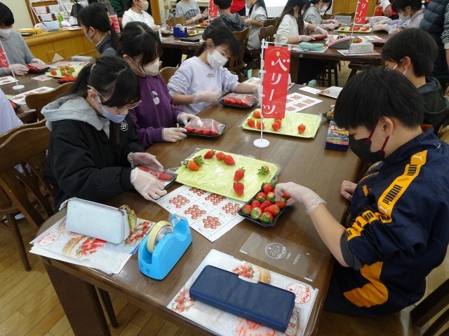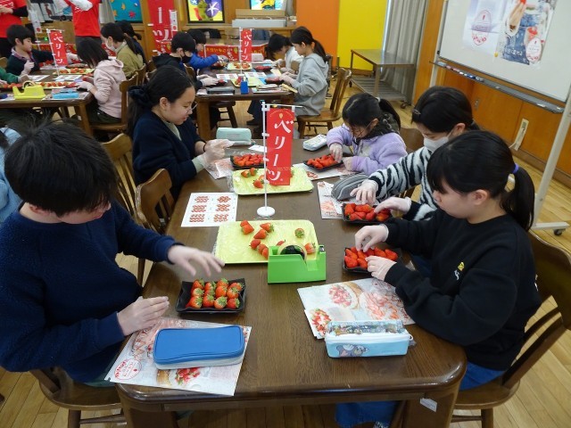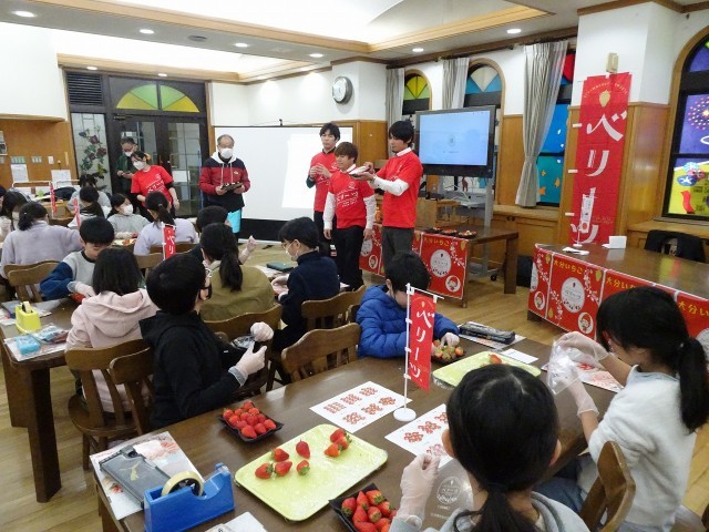 手元には、ベリーツのイチゴを用意していただいて、パックにつめていきます。生産者の方は、500パックを1日で詰めるそうです。5年生のみなさんも、1粒ずつ丁寧に並べていきます。イチゴの向きもそれぞれで、スーパーなどで売っているイチゴをよく見ているのだなぁと感心してしまいます。