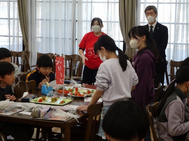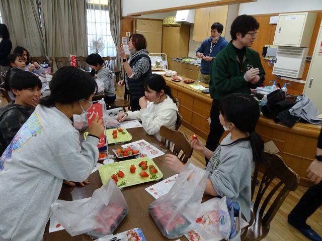 の3種類です。子どもたちは、味の特徴をワークシートにメモして、順位をつけていきます。ベリーツが1位で多いのかなと思ったのですが、さがほのか、ゆふおとめの良さも見つけて、それぞれを推していました。どのような味か、是非おうちの方に伝えてくださいね。