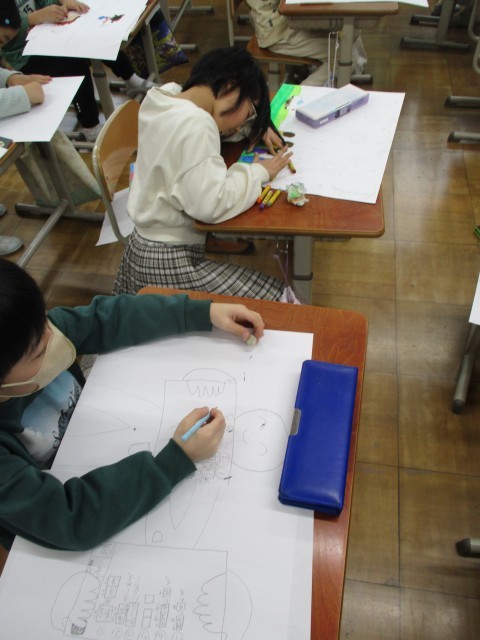 図画工作の学習では、心に残ったことを絵に書き表しています。