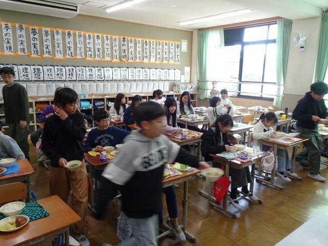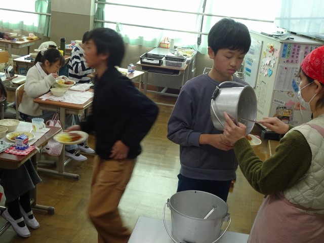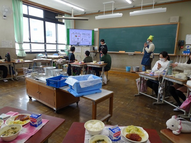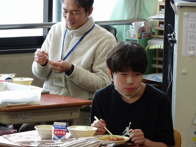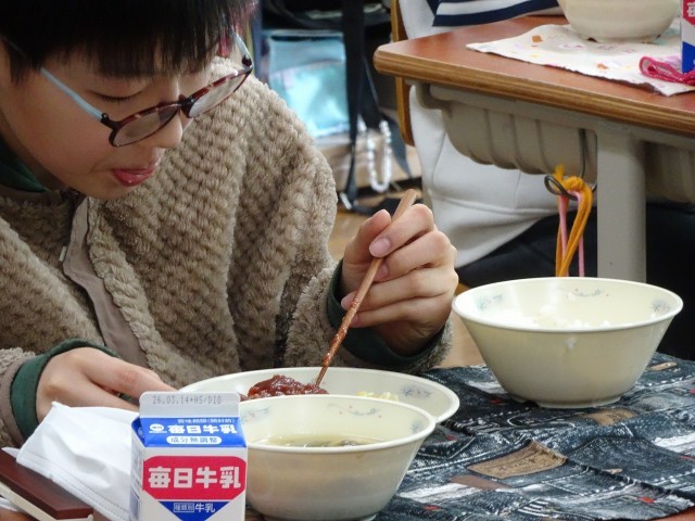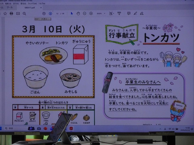 子どもたちも分厚いトンカツに驚いていました。1枚1枚、給食調理員さんが心をこめて揚げています。