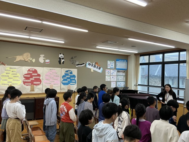 今日は、スクールサポーターの井上先生にお越しいただき5年生1回目の音楽の学習を行いました。