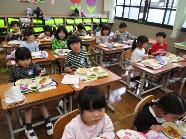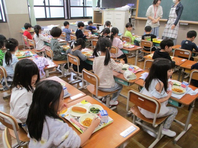 4時間目に給食の準備の仕方について学習し、いよいよ楽しみにしていた給食の時間になりました。