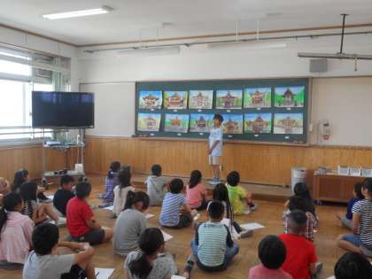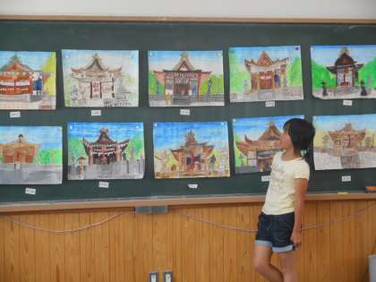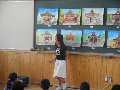 図画工作でわら天神の絵をかき進めてきました。今日は仕上がった作品を鑑賞しました。自分の作品のいいところを友達に紹介したり,友達の作品のいいところを見つけたり・・・。作品をつくるだけではなく,鑑賞することも大切な学習です。それぞれ見つけたよさを次の作品にも活かしてほしいと思います。