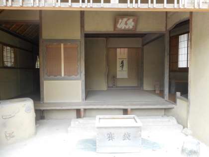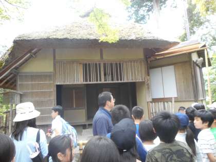 金閣のような華やかさはないのですが,室町時代の文化の学習で大切なのが茶室「夕佳亭」です。子どもたちに,「今の日本の家との共通点は何だろう。」と尋ねると,即座に「畳・障子・床の間」などの答えが返ってきました。良く見学できていました。