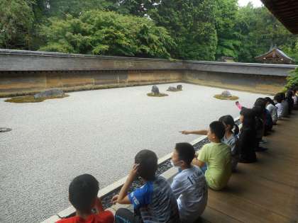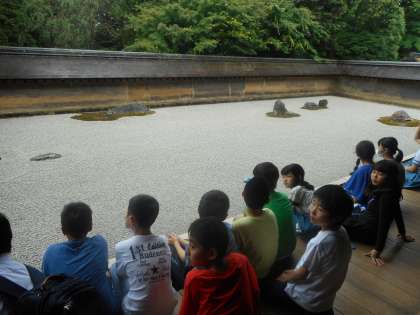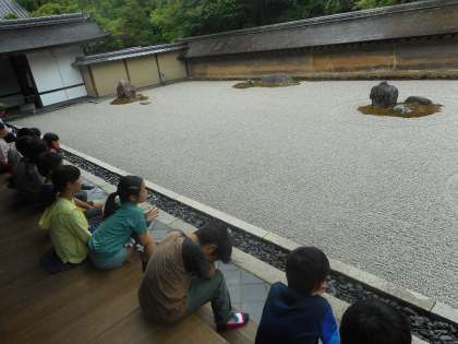 子どもたちは,石庭を前に,石の並びの意味を考えたり,どんな気持ちになるかを考えたり,15個完全には見えないことの意味を考えたりしながら,石庭と会話をしてきました。