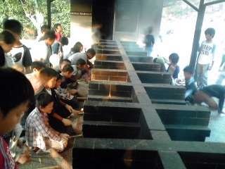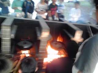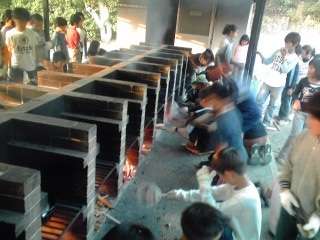 野外炊事,みんな汗だくになってがんばっています。