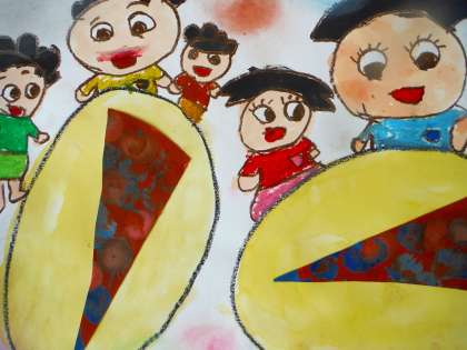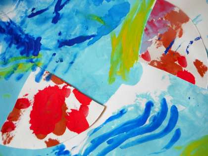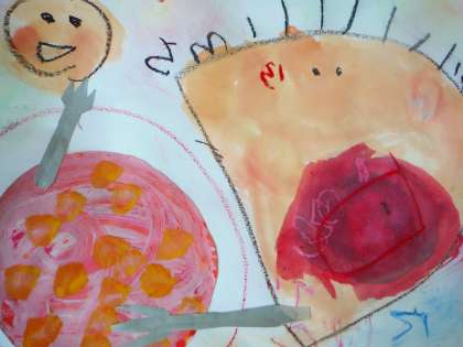 絵の具あそびで作った,まるい「ショートケーキ」を使って,思い思いの作品を仕上げました。