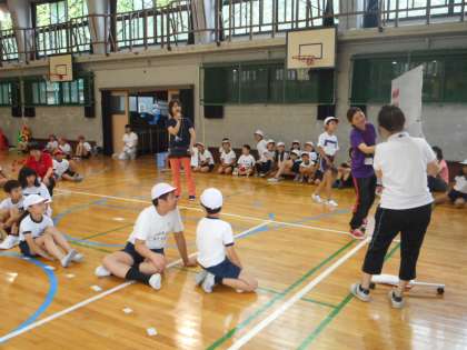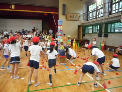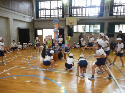 あいにくの雨模様のため,講堂で育成合同運動会を行いました。4年生は「どきどき玉入れ」に出場しました。