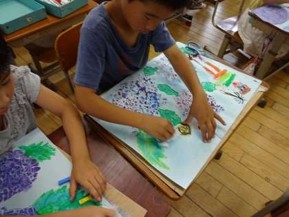 先日から描いている「あじさいの絵」の仕上げをしました。あじさいの周りに人を描いたり,色を塗ったりして雨の様子を表しました。どの子も最後まで丁寧に仕上げることができました。