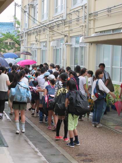 朝,7時45分に学校に集合して,出発式をしました。あいにくの雨のため講堂で行いました。天気予報はあまりよくないようですが,子どもたちの様子を見ていると,少々の雨も吹き飛ばしてくれそうなぐらい,元気いっぱいです。お見送りに来てくださいました保護者の皆様,ありがとうございました。
