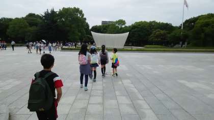 現在の広島の空模様は,薄曇りで雨の心配はありません。語り部さんのお話を聞いた後は,グループごとに平和記念公園内の碑めぐり学習をしています。一つ一つの碑をじっくりと真剣に見ています。この後は再び広電に乗り,ホテルがある宮島を目指します。