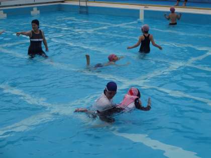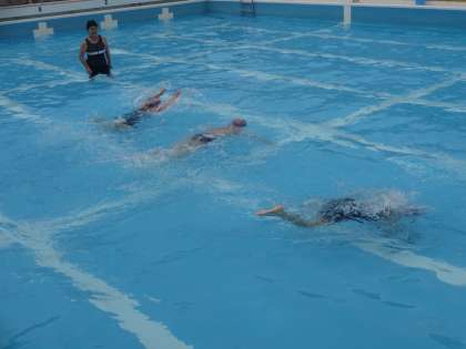 顔を水につけることを目標に、水の中でブクブク息を吐いたり、碁石ひろいをしたりして練習をしました。顔を付けられる児童は泳ぐことにも挑戦しました。