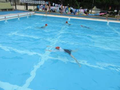 自分の泳げる距離をのばしたり,速く泳いだりできるようにバディと泳ぎ方を確かめながら練習しています。
