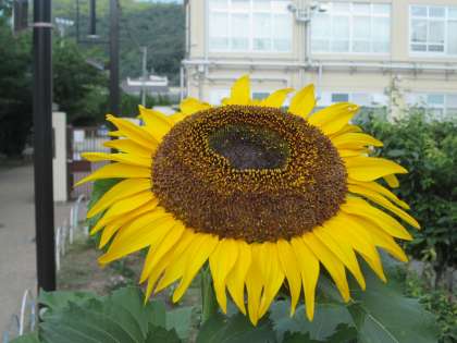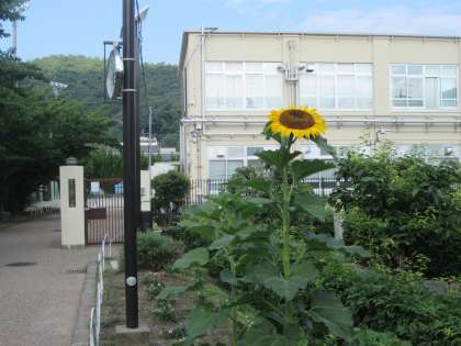 東門の外の花壇の向日葵が、いよいよ大輪の花を咲かせました。大人の背丈よりも高く、空に向かって堂々と咲いています。