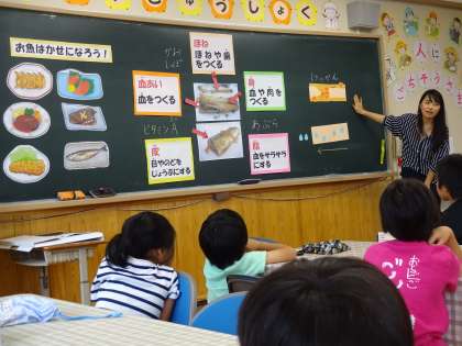 2年生に進級してから、初めてランチルームで給食を食べました。給食前に,栄養教諭の福井先生から「魚について」のお話を聞きました。骨や肉になること,肉よりも血をサラサラにすること等,いろいろ教えてもらいました。これから,積極的に魚を食べてほしいです。