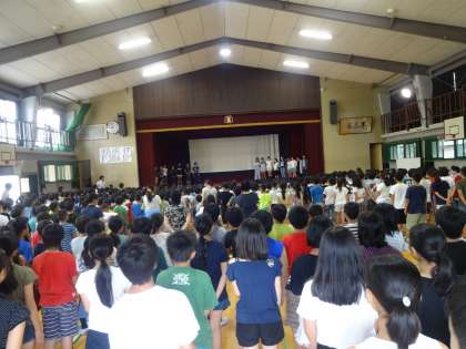今日は夏休み前の最終日です。1時間目に、全校集会を行いました。