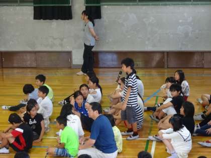 全校集会の後、金閣タイムを行いました。今回は、にじの子学級と6年生の発表でした。