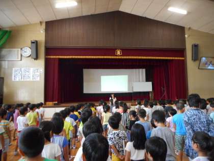 1時間目は朝会です。校長先生は4年生と一緒に「みさきの家」に行っておられるので,今日は教頭先生のお話を聞きました。まだまだ暑かったのですが,みんな立派な態度で話を聞くことが出来ました。また今日からがんばりましょう!