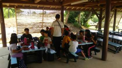 昼食も東屋でいただきました。朝から傘をさすほどではなかったのですが,小雨が降っていました。でもお昼頃から,晴れてきました。暑いですが,風があり昨日より爽やかです。1時から磯観察です。