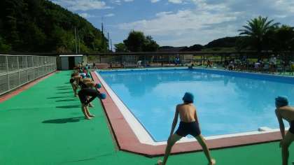 磯観察が終わって,みさきの家に帰ってきました。今度はプールに入ります。海のすぐ近くで入るプールは,学校のプールとはまた違っていて気持ちいいです。もちろん準備運動もしっかりしました。