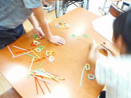 にじのこ学級で開くことになった「にじのこカフェ」。どんな準備が必要か話合い,今日はさっそく看板作りです。文字や飾りを分担して作りました。絵の具,モール,コルク,段ボールなどいろいろな材料を使って作りました。