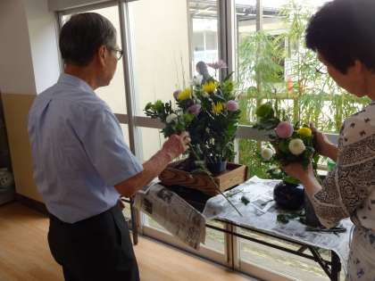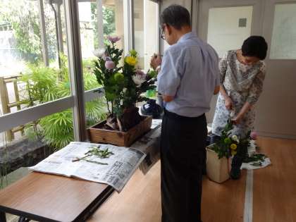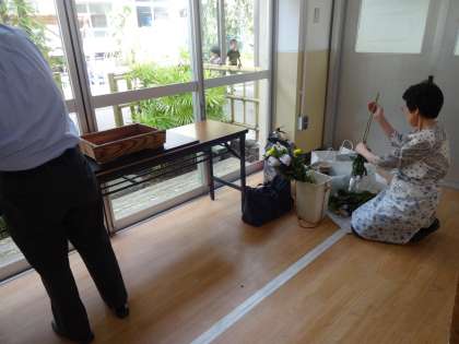 京都を発祥の地とする伝統文化の「いけばな」を、次世代を担う子どもたちに継承していくことを目的として、華道小松流家元の中村展山先生に「花育」としてエントランスに花を生けていただきました。