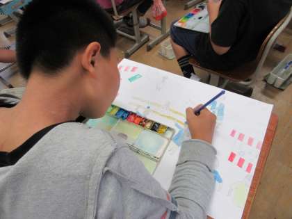 子どもたちは,絵の具と水の混ぜ方や,塗り方を工夫しながら,一生懸命活動することができました。